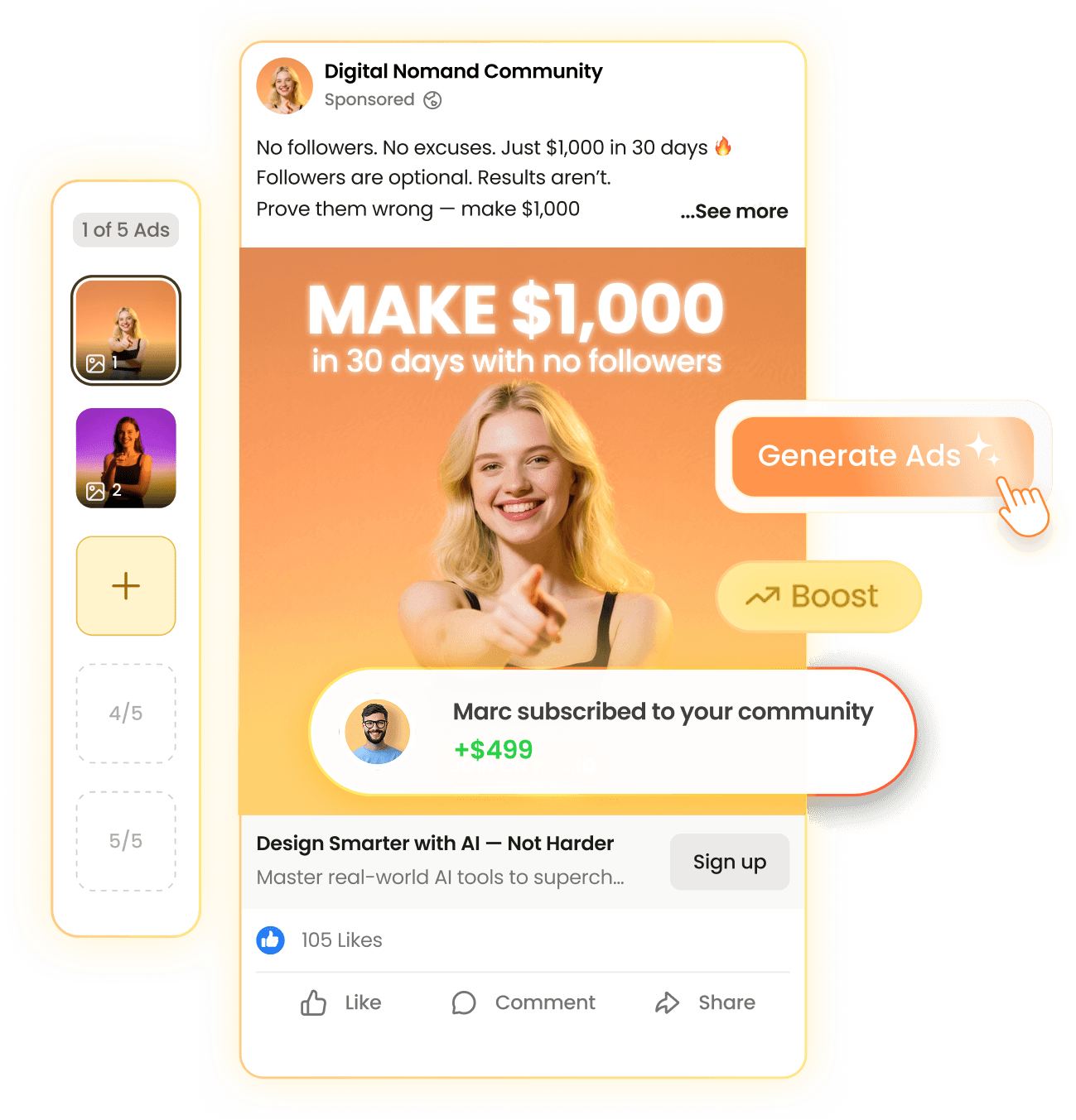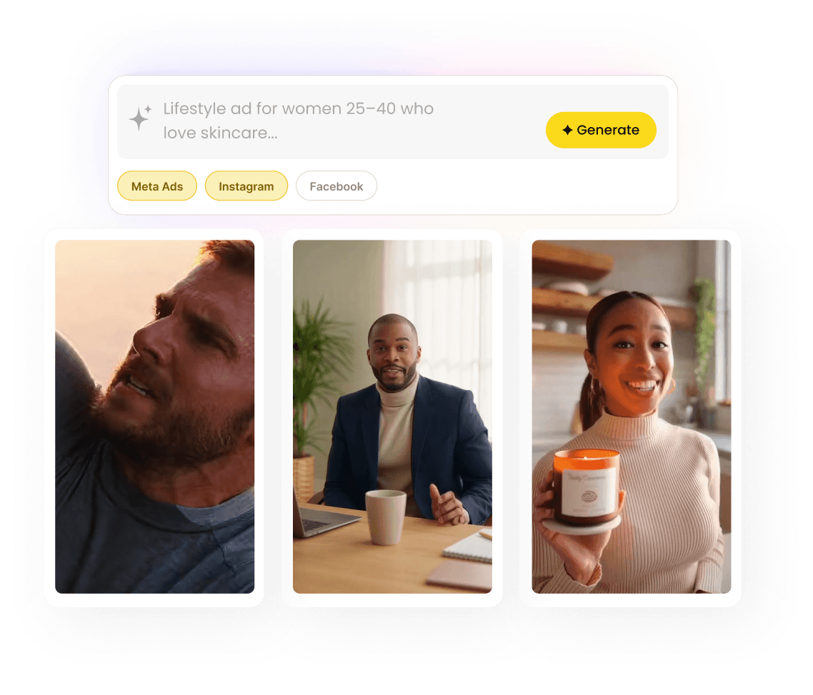 On Shopify, creating ads means hiring a designer, using Canva, or figuring it out yourself. On nas.io, you type one sentence and the AI generates photo-quality ad creatives ready to run on Meta.